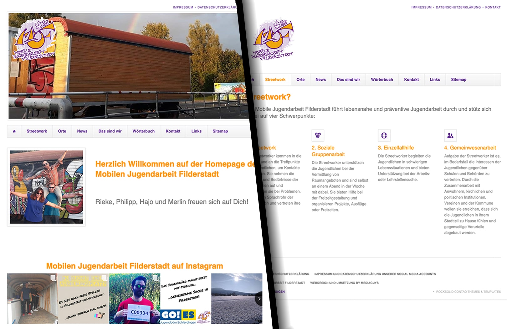 Online-Präsenz der Mobilen Jugendarbeit in Filderstadt mit Social Media Feed für Instagram und Facebook. Selbstverständlich responsiv (automatischer Anpassung für PC/Smartphone) und nach datenschutztechnischen gesetzlichen Vorgaben sowie Cookie-Consent-Banner.